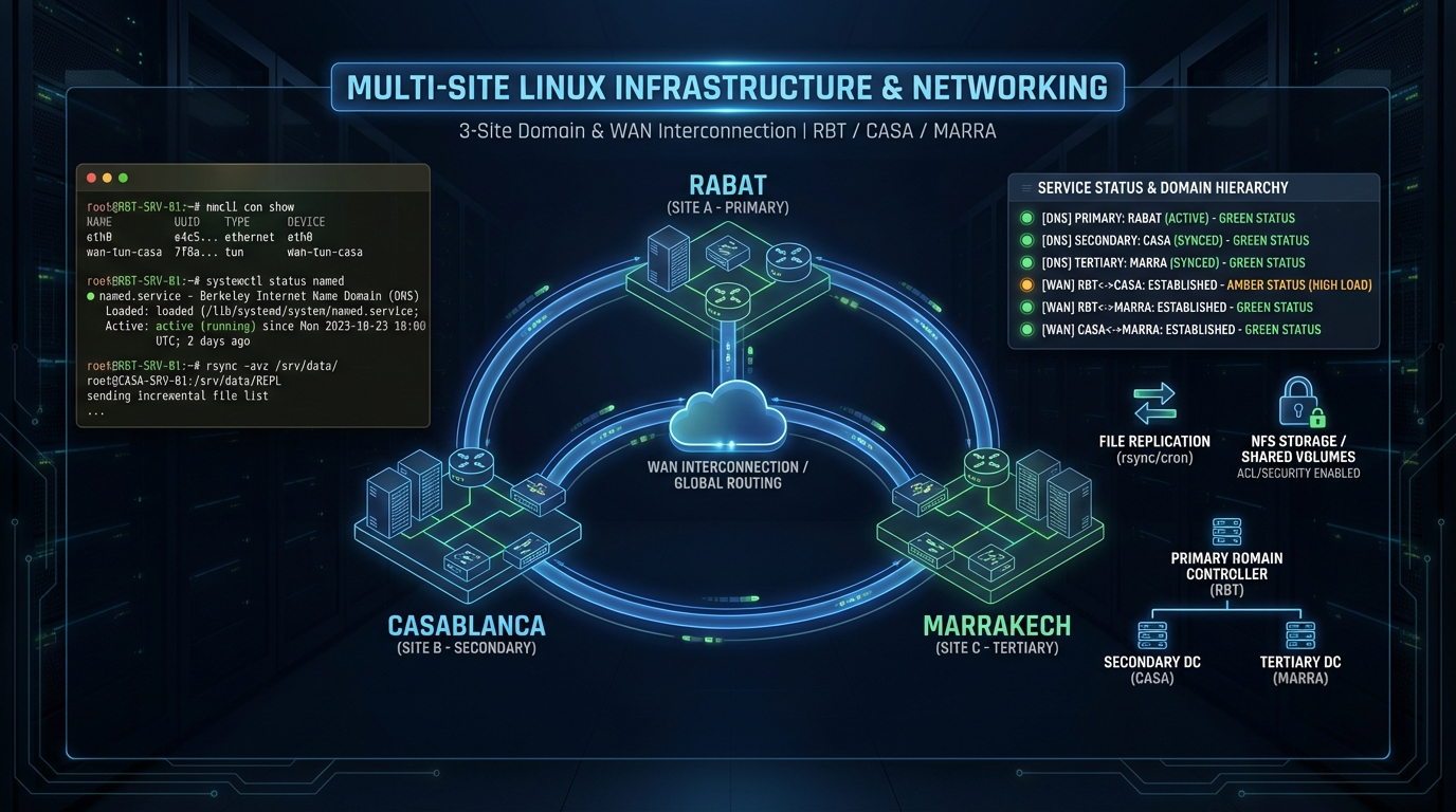 Infrastructure Linux fédérée sur 3 sites (Rabat/Casa/Marra) avec domaine maroc-tech.ma. DNS hiérarchisé (Primary/Secondary/Tertiary), NFSv4 + ACL, réplication rsync/cron, services systemd.