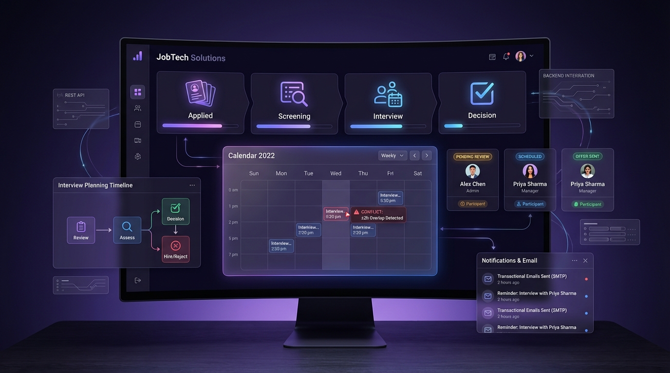 Plateforme SaaS de recrutement (Django, Python, REST, MySQL, SMTP). RBAC multi-rôles, planification d'entretiens avec détection de conflits (±2h), workflow candidature→décision, emails transactionnels.