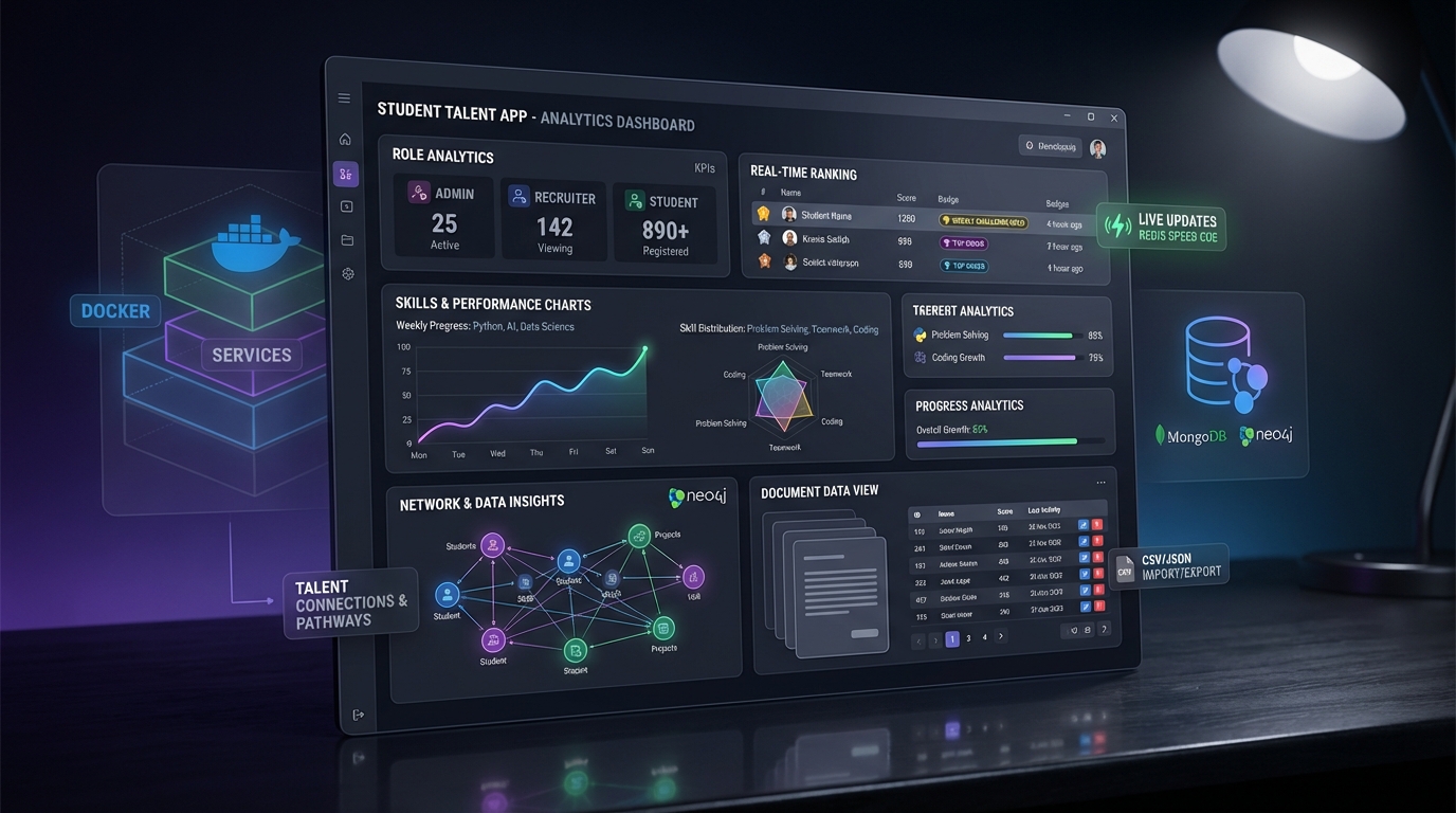 Application desktop d'analyse de talents (Python, PyQt5) basée sur Multi-NoSQL (MongoDB, Redis, Neo4j). Dashboards multi-rôles, leaderboards + défis hebdo, CRUD import/export CSV/JSONL, analytics Neo4j, bases déployées en Docker.