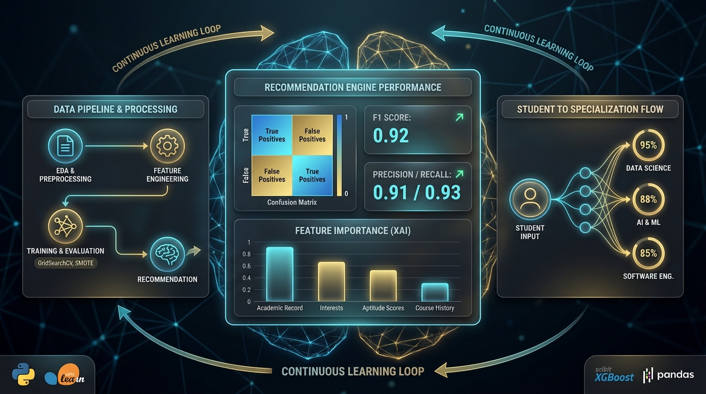 Moteur de recommandation de spécialisations (Python, scikit-learn, XGBoost). Pipeline ML complet : EDA → prétraitement → évaluation, SMOTE, GridSearchCV, XAI (feature importance, F1) et continuous learning.
