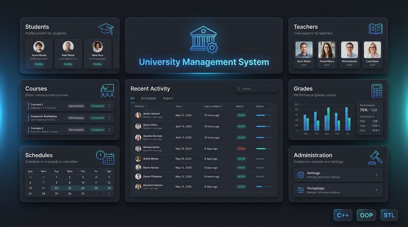 Application de gestion académique centralisée (C++, POO, STL) pour automatiser le suivi administratif entre administration, enseignants et étudiants.